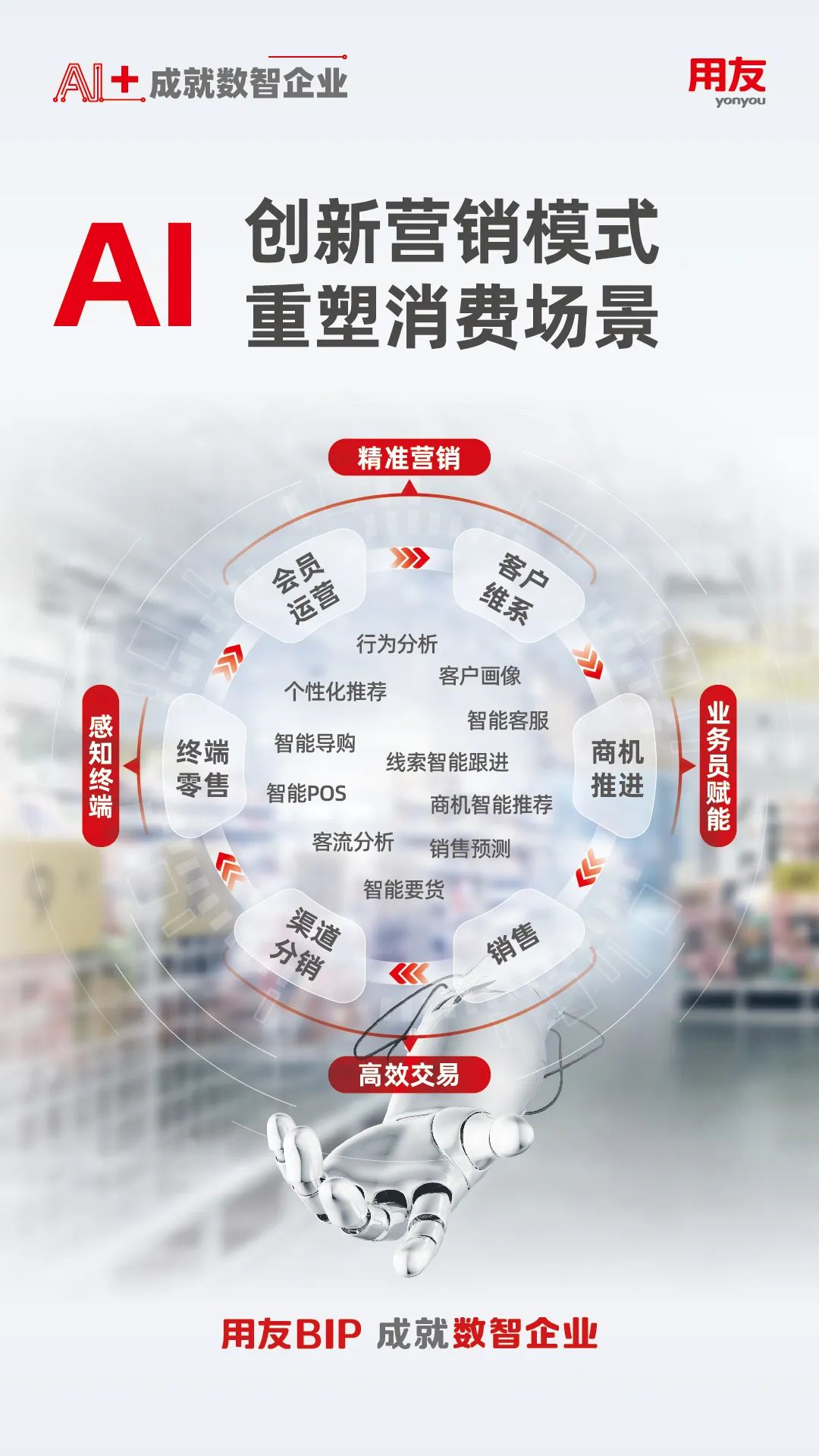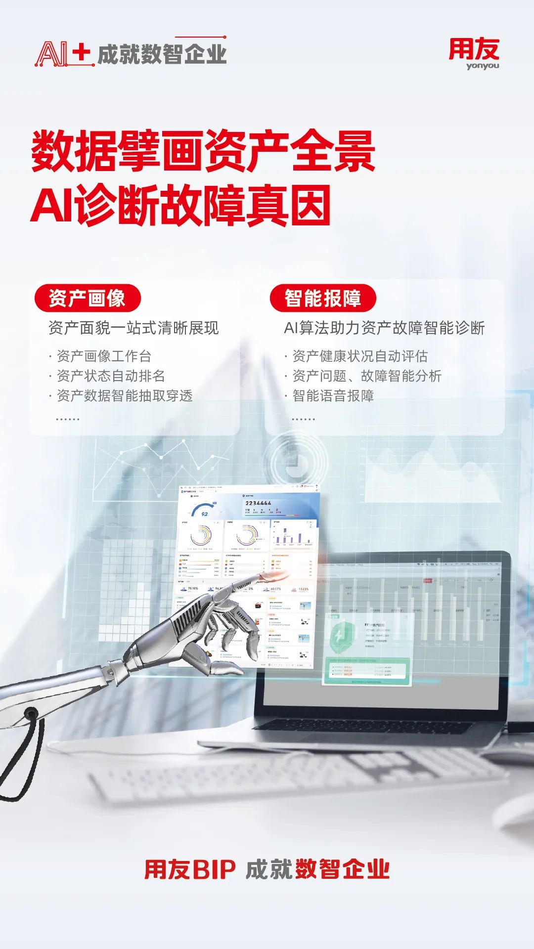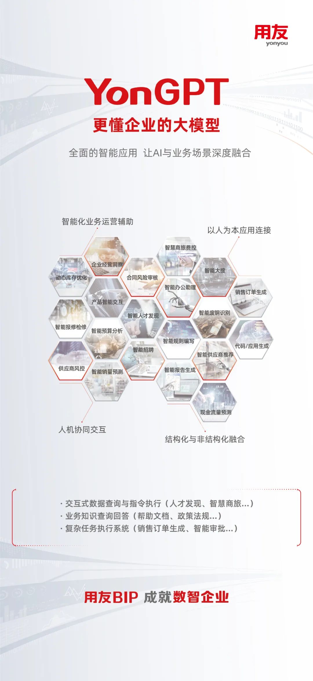 針對企業(yè)數(shù)智化創(chuàng)新發(fā)展的需要,用友戰(zhàn)略研發(fā)打造的全新一代產品—用友BIP(用友商業(yè)創(chuàng)新平臺),通過數(shù)智底座以及財務、人力、供應鏈、營銷、采購、制造、研發(fā)、項目、資產、協(xié)同等數(shù)智化服務,推動企業(yè)數(shù)智化由淺入深、由點及面進階升級,引領企業(yè)加速進入數(shù)智化時代,成就數(shù)智企業(yè)。