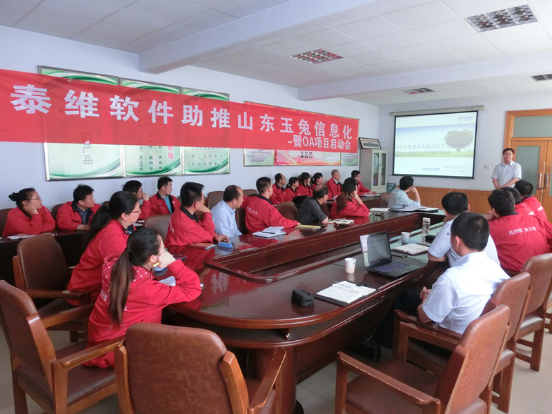 2014年5月12日早上,山東玉兔食品有限公司OA項(xiàng)目啟動(dòng)會正式召開。此次項(xiàng)目啟動(dòng)會引起了玉兔公司的高度重視,公司董事長于董和各部門負(fù)責(zé)人親自參會,會議由財(cái)務(wù)總監(jiān)郭總主持。會議開始由泰維軟件項(xiàng)目經(jīng)理張超先對OA進(jìn)行了詳細(xì)的講解,把OA的基本功能和可以實(shí)現(xiàn)的目標(biāo)向各部門領(lǐng)導(dǎo)形象的展示了出來。為了更好的把OA融入到玉兔公司中,泰維軟件將采用分階段循序漸進(jìn)的方式實(shí)施,本著進(jìn)度服從質(zhì)量的原則,更好的將OA融入到玉兔。由玉兔人力資源部穆部長帶領(lǐng)的項(xiàng)目團(tuán)隊(duì)將與泰維團(tuán)隊(duì)一起緊密合作,為公司OA項(xiàng)目的早日上線努力。